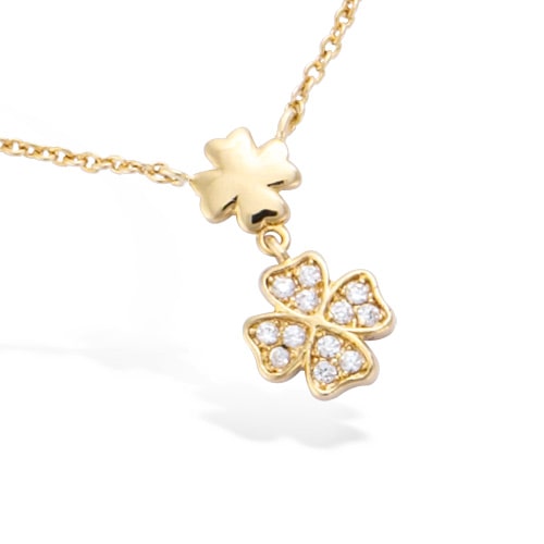 Collier deux trèfles lisse pavé oxydes blancs plaqué or