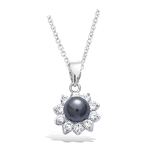 Pendentif forme fleur perle synthétique grise + CZ  argent rhodié