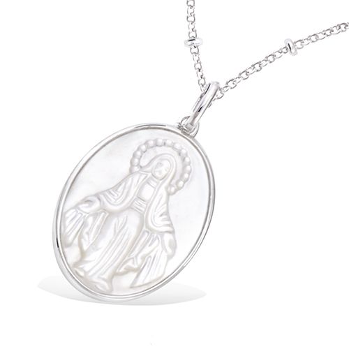 Pendentif forme ovale avec nacre motif Vierge Marie argent rhodié